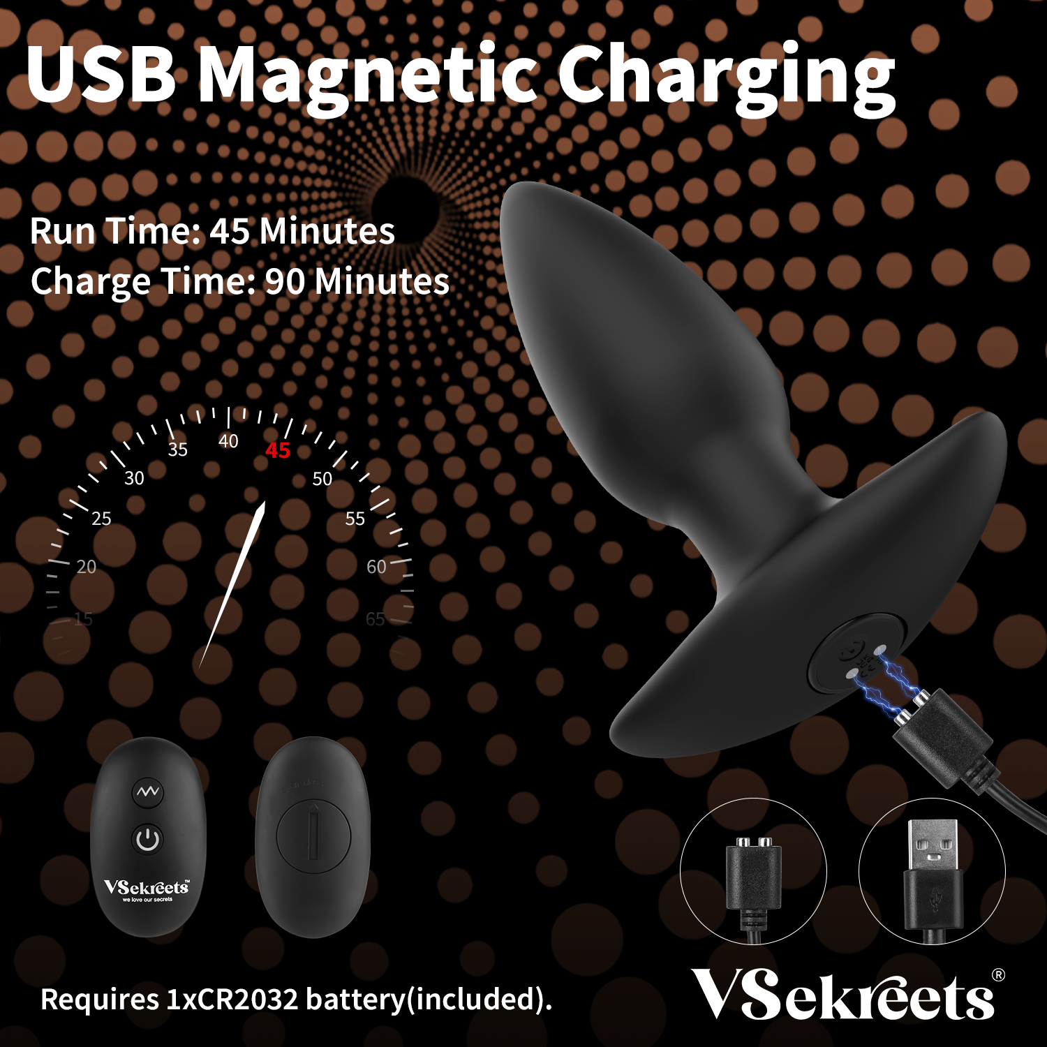 VSekreets’ vibrating butt plug with remote, is USB rechargeable with charging time of 90 minutes and running time of more than 50 minutes.This toy is IPX7 waterproof and easy for cleaning.